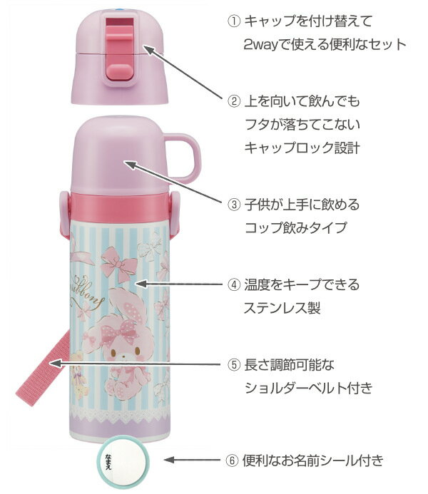 水筒 2way 直飲み コップ 超軽量 ぼんぼんりぼん くまさん 430ml ( ステンレスボトル 保温 保冷 軽量 子供 キャラクター キッズ コップ付き 直のみ ダイレクトボトル 子供用 幼稚園 保育園 サンリオ )