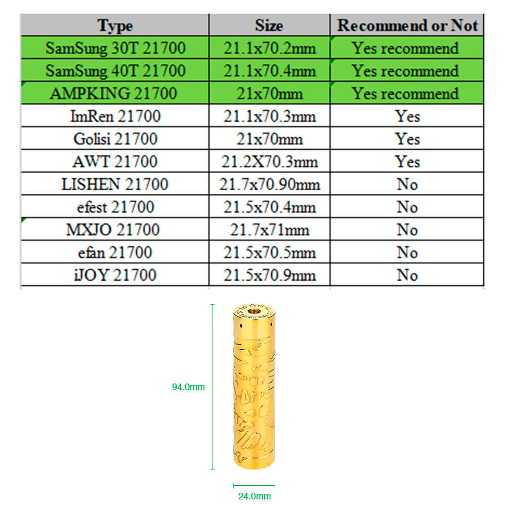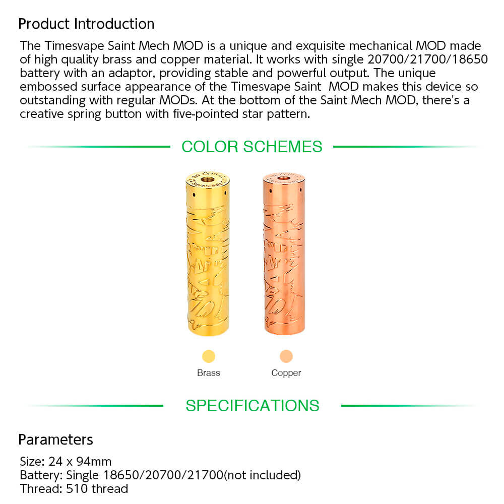 Timesvape - Saint Mech MOD Size 24 x 94mm Thread 510 thread Battery Compatible Single 18650/20700/21700(not included) パッケージ 1x Timesvape Saint Mech Mod 1x 18650 Battery Adapter 【ご注意】 メカニカルMODは保護回路など一切ない、バッテリーの電気を通電させるためだけの筒です。