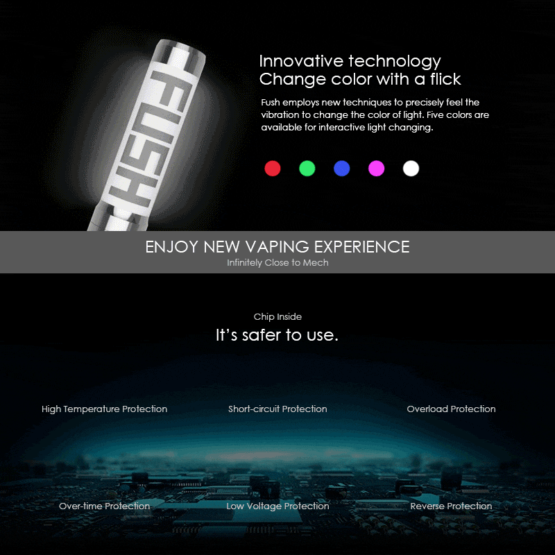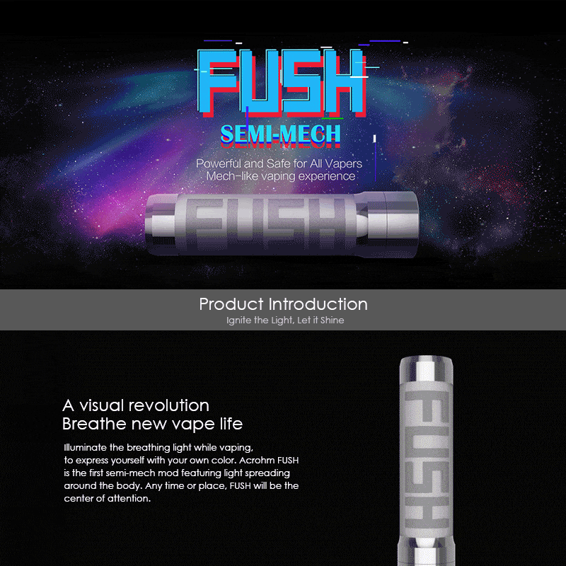 半メカニカルのチューブMODなので注意が必要な製品ですが、 使いこなせればこれほど楽しいMODはないでしょう!! ACROHM - FUSH Semi-Mech MOD Size 28 x 110mm Firing speed ≤0.01s Resistance range 0.07- 2.5ohm Material SS, bulletproof PC, copper Working temperature -30- 85 °C Maximum output current 40A bypass output battery Single Battery Single 18650 (Not included) Battery High Temperature Protection Short-circuit Protection Overload Protection Over-time Protection Low Voltage Protection Reverse Protection package 1x Acrohm FUSH Semi-Mechanical Mod 1x User Manual 主なボタン・MOD操作 電源ON/OFF:ボタン5回押し 常時点灯またはパフ時の点灯切替:ボタン3回押し LEDのON/OFF:MOD2回降り カラーチェンジ:MOD1回振り 製品仕様について バッテリー挿入時に一時点灯する仕様が施されておりますが、 メーカー生産中による品質チェックのため一定台数毎にあえて光らせる仕様となっております。