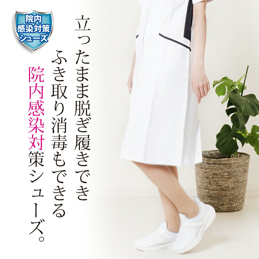 手を使わずに脱ぎ履き完了!アルコールや次亜塩素酸水で簡単にお手入れができる院内感染対策シューズ。