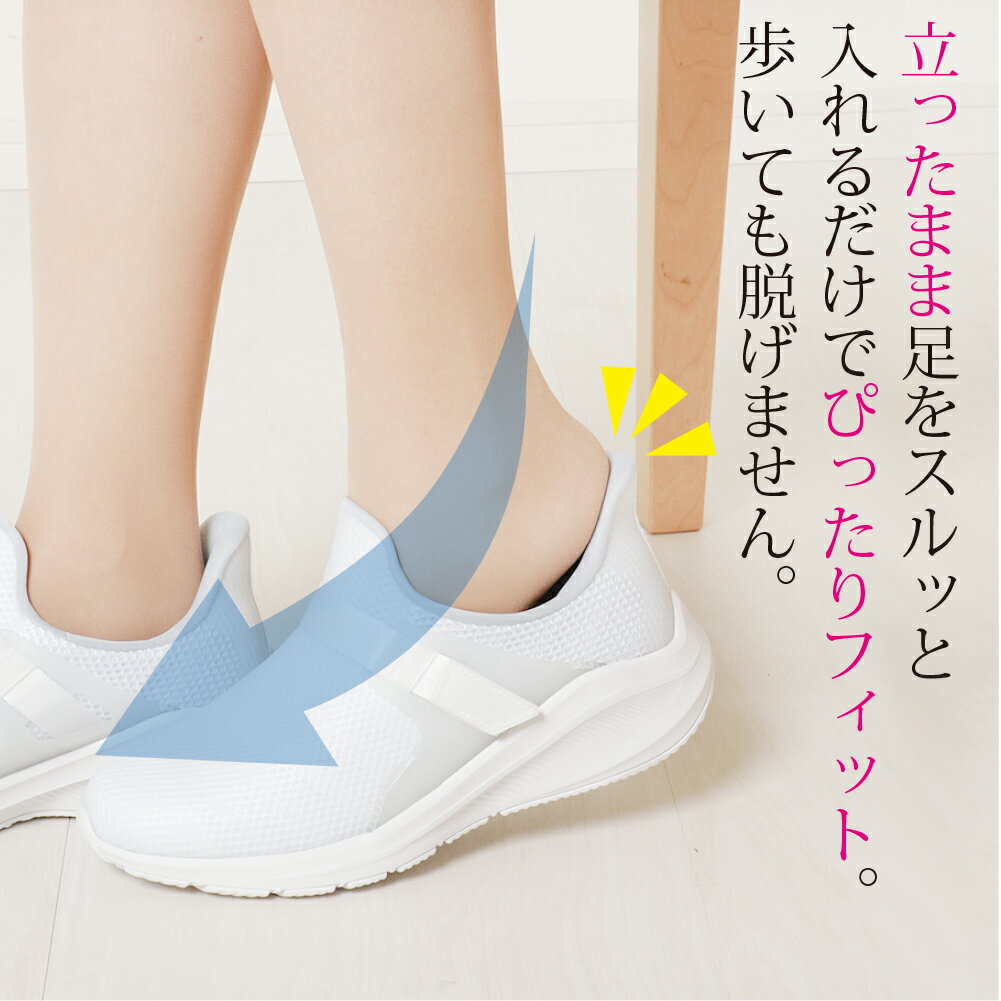 【素材】 ●アッパー:TPUコーティング/メッシュ ●中敷き:オールメッシュインソール(抗菌・防臭加工) ●ソール:EVA ●ヒール高:42ミリ ●ワイズ:3E ●片足重量:約200g(23.5センチ ●カラー:ホワイト●かかとを高くした特殊形状により立ったまま手を触れずにスッと履けます。